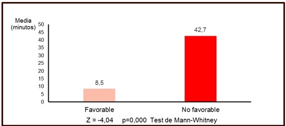 Las diferencias fueron mucho más pronunciadas con respecto al T90; el tiempo medio durante el cual los pacientes con pronóstico no favorable pasaron con desaturaciones de O2 por debajo del 90 %, fue de 42,7 minutos, mientras que en los de evolución favorable fue solo de 8,5 minutos. (Figura 4).