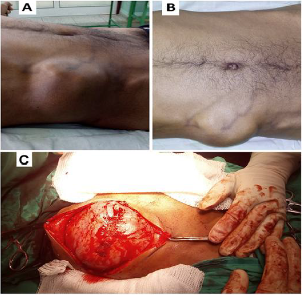 Se presentan las fotografías (figura 1) de un paciente masculino de 48 años, con antecedentes de aparente salud que presentaba una masa en la pared abdominal que en dos años fue aumentando de tamaño hasta alcanzar los 8-10 cm de diámetro, extendiéndose desde el hipocondrio derecho hasta la fosa iliaca derecha, de consistencia pétrea, no dolorosa y con bordes lisos. La lesión impresionaba sarcomatosa. En las fotografías se muestran las vistas lateral y anterior, así como transoperatoria durante la realización de una biopsia incisional. La biopsia (No. 5000/2017) informó un tumor maligno indiferenciado de alto grado, con dos posibilidades diagnósticas: 1- Sarcoma de partes blandas, 2- Metástasis de carcinoma indiferenciado.