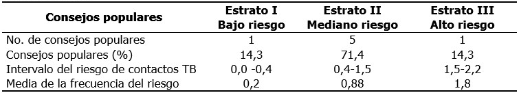 El 71,4 % de los CP estudiados según contacto con enfermos de TB, fueron clasificados como de mediano riesgo, con un valor de la media de la tasa para este riesgo de 0,88 por 100 000 habitantes (1,5-0,4), lo que correspondió a los consejos Constancia, Cieneguita, Yaguarama, Horquita, y Juraguá. Seguidamente, se encontraron dos consejos de alto y bajo riesgo, Charca y Abreus, respectivamente. (Tabla 1).