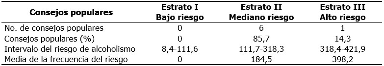En relación al alcoholismo como riesgo, el porciento del consejo ubicado en el estrato de alto riesgo fue de 14,3 %, con una media de población alcohólica de 398,2 (318,4-421,9) en Yaguaramas. Los CP Abreus, Constancia, Charca, Cieneguita, Horquita, y Juraguá estuvieron ubicados en el estrato de mediano riesgo, representado por el 85,7 %. (Tabla 2).