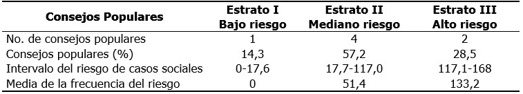 En cuanto a los casos sociales, Abreus, Constancia, Horquita y Juraguá se ubicaron en el estrato de mediano riesgo (57,2 %), con una media de 51,4 (17,7-117,0). En segundo lugar el estrato de alto riesgo con los consejos Charca y Yaguaramas para un 28,5 %. Solo el consejo de Cieneguita estuvo ubicado en el estrato de bajo riesgo con el 14,3%. (Tabla 3).