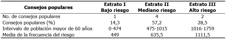 Respecto a la población mayor de 60 años, se encontraron 2 CP incluidos en el estrato de alto riesgo (Abreus y Constancia), para un 28,5 % de los casos. El valor de la media en este riesgo fue de 1111,5 (1016-1759). En cuanto al estrato de mediano riesgo se ubicaron 4 consejos que representaron el 57,2 %, y fueron Charca, Yaguaramas, Horquita y Juraguá; en el estrato de bajo riesgo quedó Cieneguita. (Tabla 4).