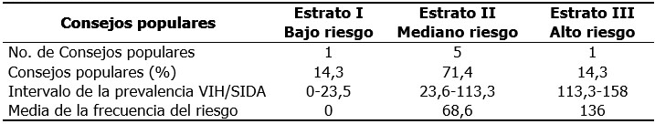 En el comportamiento del VIH/sida, solamente el consejo popular de Juraguá clasificó como de alto riesgo (14,3 %); el valor de la media para este fue de 136,0 (113,3-158). Sin embargo, 5 CP (Abreus, Constancia, Charca, Cieneguita y Horquita) tuvieron una prevalencia notable, incluidos en el estrato de mediano riesgo (71,4 %). En el estrato de bajo riesgo se encontró Yaguaramas. (Tabla 5).