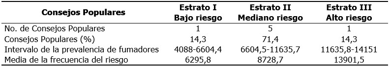 Resultados: la prevalencia del hábito de fumar fue elevada, con 5 consejos populares ubicados en el estrato de mediano riesgo, uno en el estrato de bajo riesgo, y otro (Cieneguitas) en el de alto riesgo. Los consejos populares Abreus, Charca, Cieneguita y Yaguaramas presentaron el mayor porcentaje de factores ubicados en el estrato de alto riesgo.