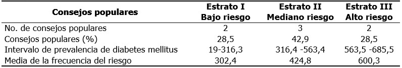 En la investigación actual con respecto a la prevalencia de la Diabetes Mellitus se obtuvo que dos CP: Abreus y Cieneguita quedaron ubicados en el estrato de alto riesgo, siendo el 28,5% con un valor de la media de 600, 3 (563,5 -685,5). En el caso del estrato de mediano riesgo se ubicaron 3 CP con el 42,5%: Constancia, Yaguaramas y Juraguá. Se situaron en el estrato de bajo riesgo 2 CP con el 28,5 %: Charca y Horquita, con una media de 302,4 (19-316,3). (Tabla 7).