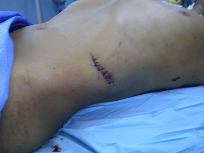 Se observó herida toracoabdominal y otra subcostal de 10 cm de longitud (Figura 1). Palpación abdominal: dolor a la descompresión en hipocondrio izquierdo.