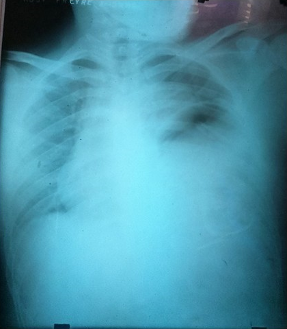 El examen físico también reveló disminución de la expansibilidad torácica y del murmullo vesicular en hemitórax izquierdo; así como murmullo conservado en hemitórax derecho. En aparato cardiovascular, desplazamiento del ápex, ruidos cardiacos taquicárdicos, no soplos. En abdomen, ruidos hidroaéreos presentes, sin rigidez abdominal.