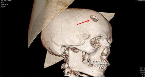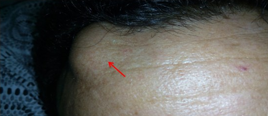 Dolor en región lumbo sacra y tórax que se exacerba a la exploración de los movimientos articulares, paraparesia a nivel de miembros inferiores, lesión tumoral de unos 4 cm de diámetro en la región derecha del hueso frontal, de consistencia dura no dolorosa de bordes regulares, de color blanco amarillento. (Figura 1).