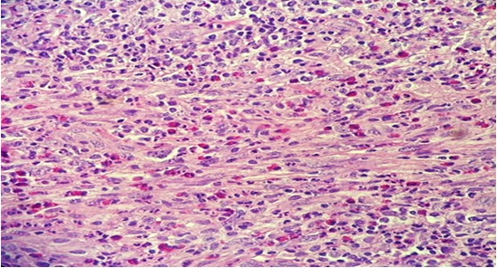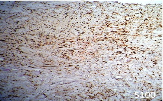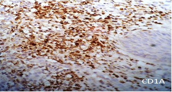 Informe de estudios histopatológicos, infiltrado celular compuesto por histiocitos y abundantes eosinofilos (Figura 4). En las evidencias inmunohistoquìmicas, se puede probar una reacción intensamente positiva al CD1-A (Figura 5) y positividad intensa al S-100 (Figura 6). Se concluye el caso como una Histiocitosis de células de Langerhans a forma poliostótica.