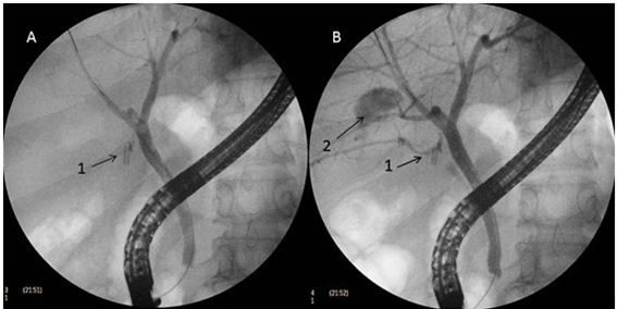 El manejo de las fugas biliares quirúrgicas con colangiopancreatografía retrógrada terapéutica endoscópica está bien establecido.(2) Sin embargo, el diagnóstico de fugas biliares traumáticas a menudo puede ser retrasado y difícil. Se ha sugerido que requieren más procedimientos terapéuticos; los pacientes tienen cursos hospitalarios más prolongados y mayores tarifas hospitalarias. Se han utilizado diversas técnicas endoscópicas para controlar las fugas biliares, las cuales incluyen: esfinterotomía biliar, colocación de prótesis (stent) biliar con o sin esfinterotomía, y drenaje nasobiliar con o sin esfinterotomía. Estos métodos comparten el objetivo común de disminuir o eliminar el gradiente de presión entre el conducto biliar y el duodeno, lo que permite un flujo preferencial de bilis desde el conducto hacia el duodeno, en lugar de que la bilis salga del sitio de la fuga. La ausencia de flujo biliar continuo a través del sitio de la fuga, permite que el defecto se cure.(3)