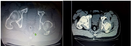 Dicho paciente fue atendido en el momento de su recepción en el área de código rojo, se valoró y se siguió el protocolo vigente para la atención de los pacientes politraumatizados implementado en nuestro centro. Se realizaron radiografías de las zonas afectadas, incluida una tomografía de la pelvis ósea. (Figuras 1 y 2).