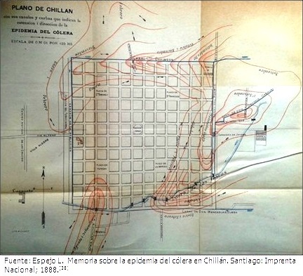 En el plano de la ciudad de Chillán se evidencia el desarrollo de la epidemia de cólera la cual duró cerca de siete meses. Se observa que la epidemia efecto la periferia de la ciudad, el estero Las Tocas favoreció que se propagara de manera más rápida. El primer caso registrado fue el 24 de agosto. La epidemia continuó su desarrollo hacia el norte hasta “la plaza Yungay, atacando los habitantes situados en ambos lados de dicha calle i en las manzanas adyacentes”,36 siendo infectadas alrededor de 35 a 40 personas en dicho barrio. Para el 2 septiembre, la epidemia se trasladó para el camino que conduce al cementerio “y al molino de Gonzalo Gazmuri”. Allí una mujer había sido encontrada muerta por las personas de la localidad y las autoridades procedieron a efectuar la autopsia con el objeto de verificar si era cólera o no.