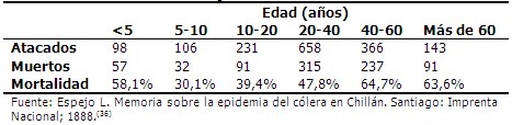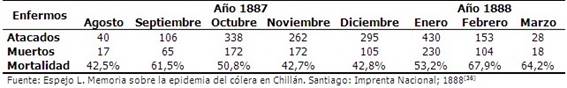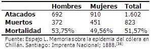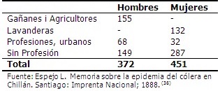 En la Tabla 1 se puede observar la mortalidad total de la epidemia de cólera en la ciudad de Chillán entre 1887 y 1888. Las mujeres lavanderas fueron las más afectadas por mantener contacto con el agua de los canales. En el registro civil aparecen 781 defunciones. La diferencia se debería a que los fallecidos por el cólera, fueron llevados directamente al cementerio, se incluyen algunos cadáveres cuyo posible origen eran de sectores rural.
