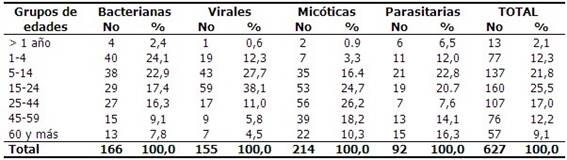 En el grupo etario de 15 a 24 años con un 25,5 % hubo mayor presentación de las afecciones infecciosas como se había apreciado anteriormente y a él correspondieron las enfermedades virales con unos 38,1 %; seguidas de las micóticas con un 26,2 % en el grupo de 25 a 44 años. En el grupo de 1 a 4 años predominaron las afecciones bacterianas con un 24,1 % y las parasitarias se vieron más frecuentemente con un 22,8 % en el grupo de 5-14 años. (Tabla 2).