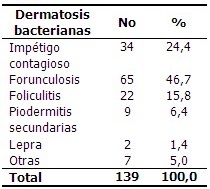 Dentro de las dermatosis de origen bacteriano la forunculosis fue la más frecuente con un 46,7 %, seguida por el impétigo contagioso con un 24,4 %. Se diagnosticaron dos casos de lepra que se encuentran en periodo de observación. (Tabla 3).