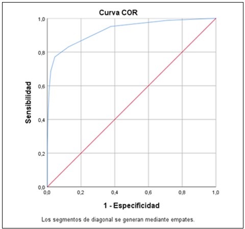 Construcción y validación del modelo de predicción: Una vez identificados los factores de riesgo con influencia independiente se procedió a la creación del índice predictivo. Se consideró que este debía estar formado por ítems que se integrarían en un índice global que tomaría la forma de una combinación lineal entre los ítems. A cada una de las variables retenidas por el modelo generado mediante la regresión logística, se le asignó el puntaje de su coeficiente de regresión (se aproximó a números enteros). Una vez confeccionado el índice predictivo se sometió a un estudio de eficacia diagnóstica y se generaron curvas receptor- operador (ROC, por sus siglas en inglés).