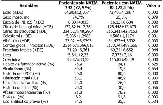 Variable analizadas: NAIIA; edad (años cumplidos); escala de NIHSS (puntos), cifras de hemoglobina, plaquetas, colesterol, albúmina, conteo global linfocitos, proteínas totales, urea, creatinina; sexo (masculino/femenino), hábito de fumar (si/no), historia de enfermedad pulmonar obstructiva crónica (EPOC) (si/no), alcoholismo (si/no), fibrilación atrial (si/no), insuficiencia cardiaca (si/no), ictus previo (si/no), presencia de afasia motora/disartria (si/no), disfagia (si/no), uso de antibiótico en los últimos 30 días (si/no).