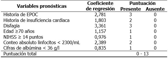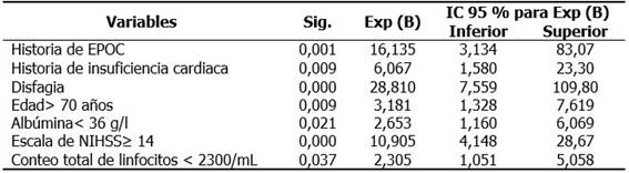 Fueron identificadas siete variables con influencia independiente sobre al pronóstico de NAIIA, entre ellas sobresalieron la disfagia (Exp (B) 28,8; IC 95 % 7,5-109,8), el antecedente de EPOC (Exp (B) 16,1; IC 95 % 3,1-83,0), y una puntuación de NIHSS≥ 14 (Exp (B) 10,9; IC 95 % 4,1-28,6). Otros factores identificados fueron la historia de insuficiencia cardiaca, la edad> 70 años, la albúmina< 36 g/l y el conteo total de linfocitos < 2300/mL. (Tabla 2).