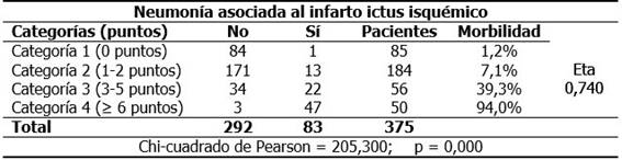 Results: 22.1 % of the patients developed pneumonia associated with acute ischemic stroke. The index presented good discriminative capacity (area under the ROC curve 0.928), with a positive predictive value of 97.60 %, a sensitivity of 92.23 %, specificity of 89.39%, and a positive likelihood ratio of 8,70. The value of the Eta association coefficient was 0.740.