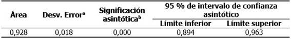 Cuando se probó la capacidad de predecir la NAIIA, estimada con la función obtenida por el modelo de regresión, se encontró un área bajo la curva ROC significativamente mayor de 0,75 (0,928; IC: 95 %; 0,894-0,963). (Figura 1, Tabla 5).