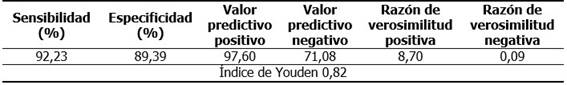 La capacidad del índice para detectar un sujeto enfermo fue de 92,23 %; la probabilidad condicional de que los individuos con la prueba positiva tuvieran realmente la enfermedad fue del 97,60 %. Los enfermos tuvieron 8,70 veces más probabilidad de que el índice los diagnosticara con NAIIA. La veracidad de la prueba fue documentada por un índice de Youden cercano a uno (0,82). (Tabla 6).