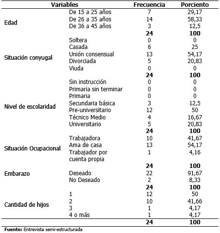 En la serie de casos existió predominio del grupo etario de 26 a 35 años (58,33%). En cuanto a la situación conyugal, la unión consensual se presentó en un mayor porciento (54,17%). El nivel de escolaridad que prevaleció fue el Pre- universitario (50 %), seguido del universitario (20,83%). Nótese que existió predominio de amas de casas (54,17%). El embarazo deseado resultó el más representativo (91,67%). Por último, se observó que predominaron las madres con uno y dos hijos. (Tabla 1).