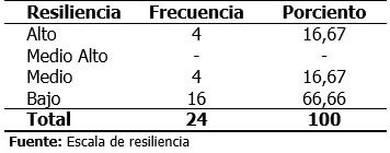 Al analizar la capacidad de resiliencia se observó predominio de capacidad baja en 16 de los casos (66,66 %), en igual proporción se encontraron las madres con capacidad media y alta de la resiliencia (16,67 %). No se registraron madres con nivel medio alto de resiliencia. (Tabla 2).