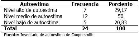 Existió un predominio del nivel medio de autoestima en las madres (50 %), solo siete madres mantenían un nivel alto de autoestima; por último, cinco de las madres tenían un nivel bajo de autoestima (20,83 %). (Tabla 3).