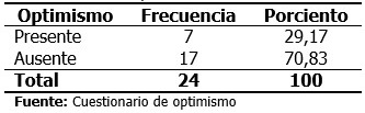 El optimismo se manifestó como ausente en el 70,83 % de las madres, solo siete mostraron presencia del mismo (29,17 %). (Tabla 4).