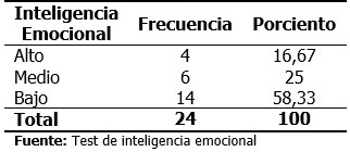 El grado de inteligencia emocional que se diagnosticó con mayor frecuencia fue el bajo, presente en l4 de las madres estudiadas (58,33 %), seguido de un nivel medio de inteligencia emocional en un 25 %. (Tabla 5).