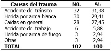 Los accidentes del tránsito con 32 pacientes (31,38%) fueron la causa predominante, en menor medida lo fueron las armas de fuego con 3 pacientes, para un 2,94%. (Tabla 2).