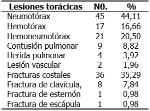 El neumotórax, con 45 pacientes (44,11%), fue la lesión torácica más frecuentemente observada, seguida de las fracturas costales con 36 pacientes (35,29%); las menos observadas, con un paciente cada una, fueron las fracturas de esternón y escápula. (Tabla 3).