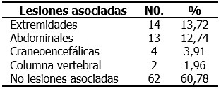 Las lesiones asociadas al trauma torácico más encontradas fueron en las extremidades, presentadas por 14 pacientes (13,72%), seguidas de las abdominales, con 13 pacientes (12,74%). En 62 pacientes (60,78%) no hubo lesiones asociadas. (Tabla 4).