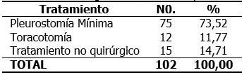 La pleurostomía mínima fue el tratamiento más empleado en el trauma torácico, realizado a 75 pacientes (73,52%), seguido del tratamiento no quirúrgico 15 pacientes (14,71%). (Tabla 5).