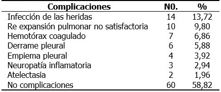 En cuanto a las complicaciones de los traumas torácicos, se observó que la infección de la herida ocupó el primer lugar, con 14 pacientes (13,72 %), la menos observada fue la atelectasia con 2 pacientes (1,96 %). En 60 pacientes (58,82 %), no se presentaron complicaciones. (Tabla 6).