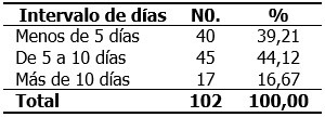 Predominó la estadía hospitalaria de 5 a 10 días con 45 casos (44,12 %), seguido en menos de 5 días, con 40 casos (39,21%) y en màs de 10 días 17 casos (16,67%). (Tabla 7).