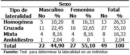De un total de 49 estomatólogos zurdos estudiados, 55,10 % son del sexo femenino, el 55,10 % manifestó lateralidad cruzada comportándose esta última de manera regular en ambos sexos. Es válido destacar que el 100 % tiene una lateralidad manual forzada. (Tabla 1).
