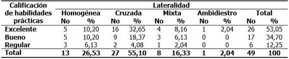 Al relacionar las habilidades prácticas teniendo en cuenta el tipo de lateralidad, se observó que el 53,05 % de los estomatólogos zurdos encuestados tienen excelentes habilidades y entre ellos el 32,65 % presentan lateralidad cruzada y solo el 12,25 % fue evaluado de regular, todos ellos estudiantes. El 100 % tanto estudiantes como profesionales coincidieron en que sus habilidades mejoraron a partir del 8vo semestre de la carrera es decir en el segundo semestre del cuarto año. Es remarcable el hecho de que ninguno obtuviera la calificación de mal en las habilidades. (Tabla 2).