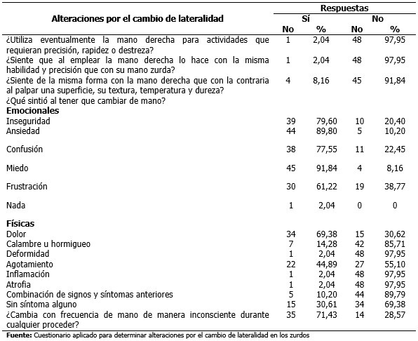 Se constató que el 97,95 % de la muestra no utiliza eventualmente la mano derecha para actividades que requieran precisión, rapidez o destreza, ni siente que al emplear la mano derecha lo hace con la misma habilidad y precisión que con su mano zurda. El 91,84 % sintió miedo al cambiar de mano mientras que el 89,80 % sintió ansiedad y el 79,60 % inseguridad. Sintió dolor el 69,38 % y 44, 89 % agotamiento. Es significativo que el 71,43 % cambie de mano de manera inconsciente durante cualquier proceder. (Tabla 3).