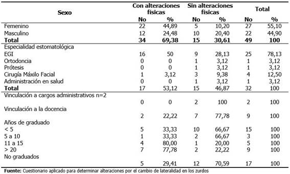 Methods: retrospective descriptive study conducted in the Cienfuegos province in the period from September 2017 to June 2018. A number of 49 left-handers were included (17 students of 4th and 5th year and 32 graduates) The variables were: sex, laterality, practical skills, alterations due to forced laterality, dental specialties, years of work.