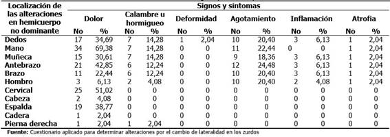 La alteración más frecuente fue el dolor muscular principalmente en mano con un 69,38; la región cervical con un 51,02 % y la espalda con el 38,77 %, seguido del agotamiento en mano con 22,44 %, y 24,48% lo manifestaron en antebrazo. Es notorio un profesional con atrofia de la mano derecha. (Tabla 5).