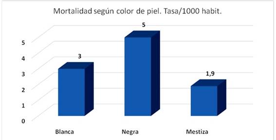 El mayor número de muertes se observó en personas de color blanco de la piel (54 %), pero teniendo en cuenta que aproximadamente las dos terceras partes de la población cubana es blanca, y considerando constante la variación de la estructura de la población del municipio para el censo de 2012 por color de piel, se calcularon las tasas por grupos de color de la piel por 1 000 habitantes, lo que aportó tasas de mortalidad de 5 para las personas de piel negra, 3 para las de piel blanca y 1,9 para las mestizas por cada mil habitantes. (Gráfico 1).