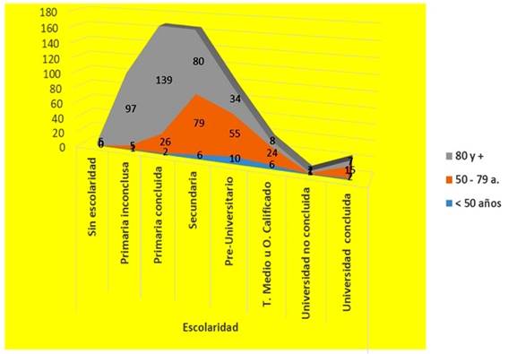 Al cruzar la escolaridad con los grandes grupos de edades, se encontró variación del diferencial según escolaridad a medida que aumentó la edad, es decir, a mayor edad, menor nivel de escolaridad, y viceversa, coincidiendo así en los menores de 50 años con los niveles de escolaridad de Cuba. (Gráfico 2).