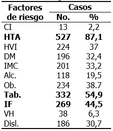 La correlación factores de riesgo según sexo, mostró el mayor consumo de tabaco (65,3 % respecto a 41,8 %) y alcohol (28,4 % respecto a 8,8 %) por los hombres; así como mayor IF en las mujeres (51,5 % respecto a 38,7 %), mayor frecuencia de DM (38,3 % respecto a 27,5 %), de dislipidemia (35 % respecto a 27,2 %) y mayores VH (12,8 % respecto a 0,9 %).