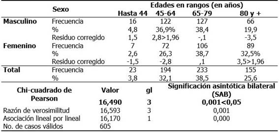 Al correlacionar la variable sexo con los diferentes grupos de edades, se obtuvo relación estadísticamente significativa con los hombres de edades entre 45 y 64 años; y con mujeres de 80 y más años. (Tabla 2).