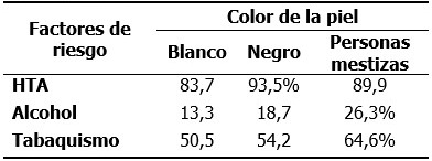 El análisis de las variables color de piel y los factores de riesgo cardiovasculares en este grupo reveló la existencia de significación estadística para el color de la piel con la HTA (SAB=0,008), Alc. (SAB=0,010) y Tab. (SAB=0,005). Las fallecidos de piel negra se vieron más afectados por la HTA (93,5%), y los mestizos por el tabaquismo (64,6 %) y el alcoholismo (26,3 %). (Tabla 3).