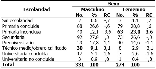 La significación por celda de los residuos corregidos (RC) indicó la relación estadísticamente significativa de hombres técnico medio u obrero calificado (3,1), y de mujeres con la primaria inconclusa (3,6). (Tabla 4).
