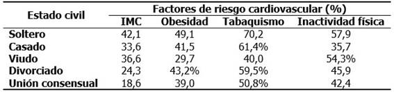 Con respecto a la relación entre el estado civil y algunos factores de riesgo cardiovasculares, se manifestó significación estadística de esta variable con el IMC (SAB=0,042), la Ob.(SAB=0,044), el Tab. (SAB=0,000) y la IF (SAB=0,001). Los solteros tuvieron más IMC, fueron más afectados por obesidad, por hábito de fumar e IF; también los casados, los divorciados y aquellos en unión consensual, se destacaron por el hábito de fumar, mientras que en los viudos predominó la IF. (Tabla 5).