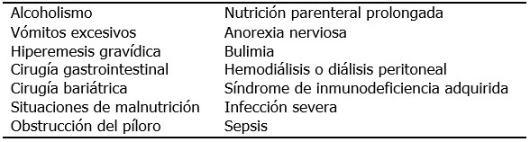 Existen situaciones especiales que aumentan la predisposición a padecer encefalopatía de Wernicke (Cuadro 1),(1) siendo en nuestro caso precisamente los vómitos excesivos acompañados de la malnutrición y posteriormente la cirugía gastrointestinal recibida, las causas que llevaron a la depleción de tiamina con la consiguiente aparición de la EW en la paciente.