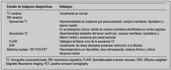 La resonancia magnética es el método de elección para el estudio de la encefalopatía de Wernicke y de la encefalitis por CMV. Entre los hallazgos generales en la encefalopatía de Wernicke, se encuentra el realce intenso en la sustancia gris periacueductal, los cuerpos mamilares, el tálamo medial (adyacente al tercer ventrículo) y el hipotálamo. (Cuadro 2).(6)